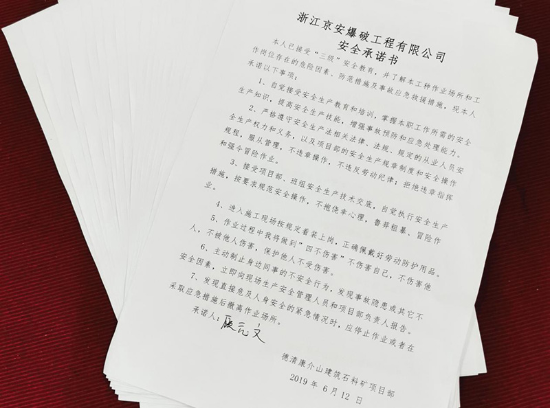 四、開展“安全生產承諾書”活動。“自覺履行崗位安全職責,嚴格遵守安全操作規程,做到不違章作業,不冒險蠻干,不違反勞動紀律……”,全體施工人員在認真學習安全生產承諾內容的基礎上,嚴肅認真簽上了自己的名字,莊嚴承諾安全生產,共簽訂承諾書21份;通過本次承諾書的簽訂,使全體施工人員感受到“簽下的是承諾,扛起的是責任”,都再次明確了自己在安全生產上的職責和義務,要共同承擔起施工安全生產的重任。